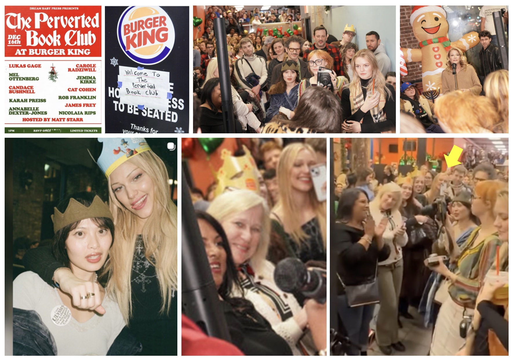 Along with 400 other attendants, Grace was at a Perverted Book Club reading at a Burger King in lower Manhattan. Journalist Carole Radziwill wrote about the event: "Only in NYC can you get a group of writers, actors, comedians, playwrights and generally questionable characters to read erotica at a packed Burger King made famous on 9/11 when it became the makeshift headquarters for the NYPD. Only in New York, baby. 👑" Author Brian Larson wrote "… think literature upstairs, whoppers downstairs, and a menorah lighting for Chanukah with a rabbi in tow. it’s really the best of NYC." Grace was photographed with model and actress Mina Le, and can be seen in several of the photos from the event. Among the performers, doing a scene from her one-woman show, were Sex & The City author, Candace Bushnell. Avenue Magazine reported from the event.