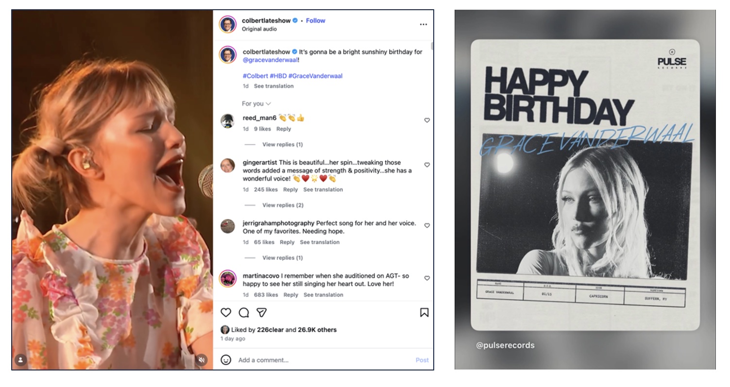 Grace's label Pulse Records and (suprisingly) The Late Show with Steven Colbert wished Grace a happy birthyady on their Instagram accounts