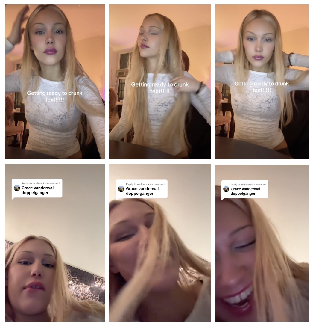 Grace posted twice on tik TikTok. Once "Getting ready to drunk text!!!!", and once reacting to an online commenter writing "Grace Vanderwaal Doppelgänger".