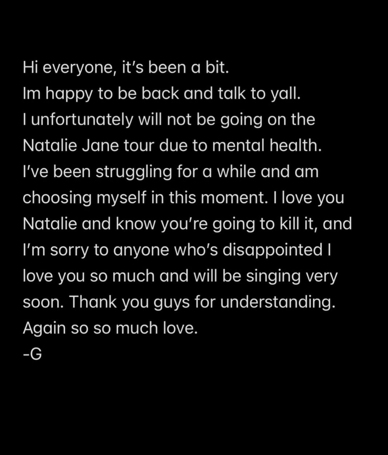 I unfortunately will not be going on the Natalie Jane tour due to mental health.