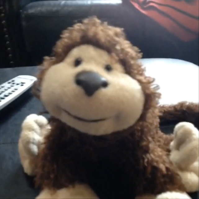 Her toy monkey attacks Kuro the dog