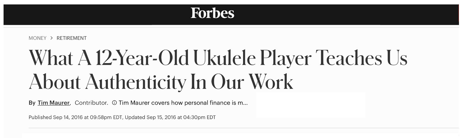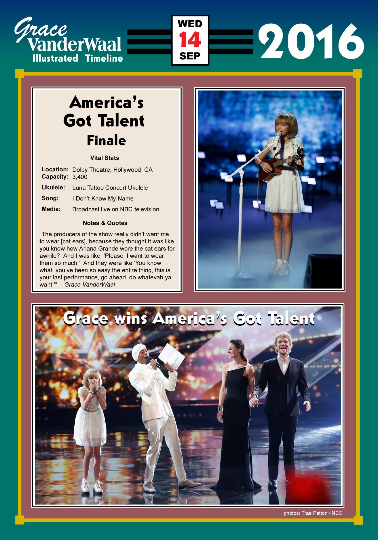 The day Grace won, Tim Mauer, who writes about personal fiance for Forbes, published a short piece about Grace, titled "What A 12-Year-Old Ukulele Player Teaches Us About Authenticity In Our Work". "I’m not a music writer. My specialty is personal finance, of which career is a primary component. I don’t watch reality television contests, [but] on our way to another channel, my family stumbled on America’s Got Talent a few months ago just in time to see one of my favorite instruments—the ukulele—adorning the neck of a diminutive blond girl. … By the end, I’m visibly crying. Everyone loves her, the judges anointing her with instant superstardom. She, in turn, is shocked, overwhelmed that she put every bit of herself out there for the world to see—and the world embraced her. … Without an ounce of pretension, but with conviction in who she is and what she does, she brought the house down. 'On paper,' her voice couldn’t compete with the virtuoso opera singer. She didn’t have an ounce of the showmanship of the Sinatra protégé, and she was clearly the least experienced of the entire field. But she was easily the most comfortable in her own skin. She seemed to need the praise least of all. “I’m just glad it’s over,” she said in response to the standing ovation. For the first (and likely last) time, I actually got on my phone to vote for a reality show contestant." (He then proceeds to list what Grace could teach us about making the most of our pursuits, passions, and professions)