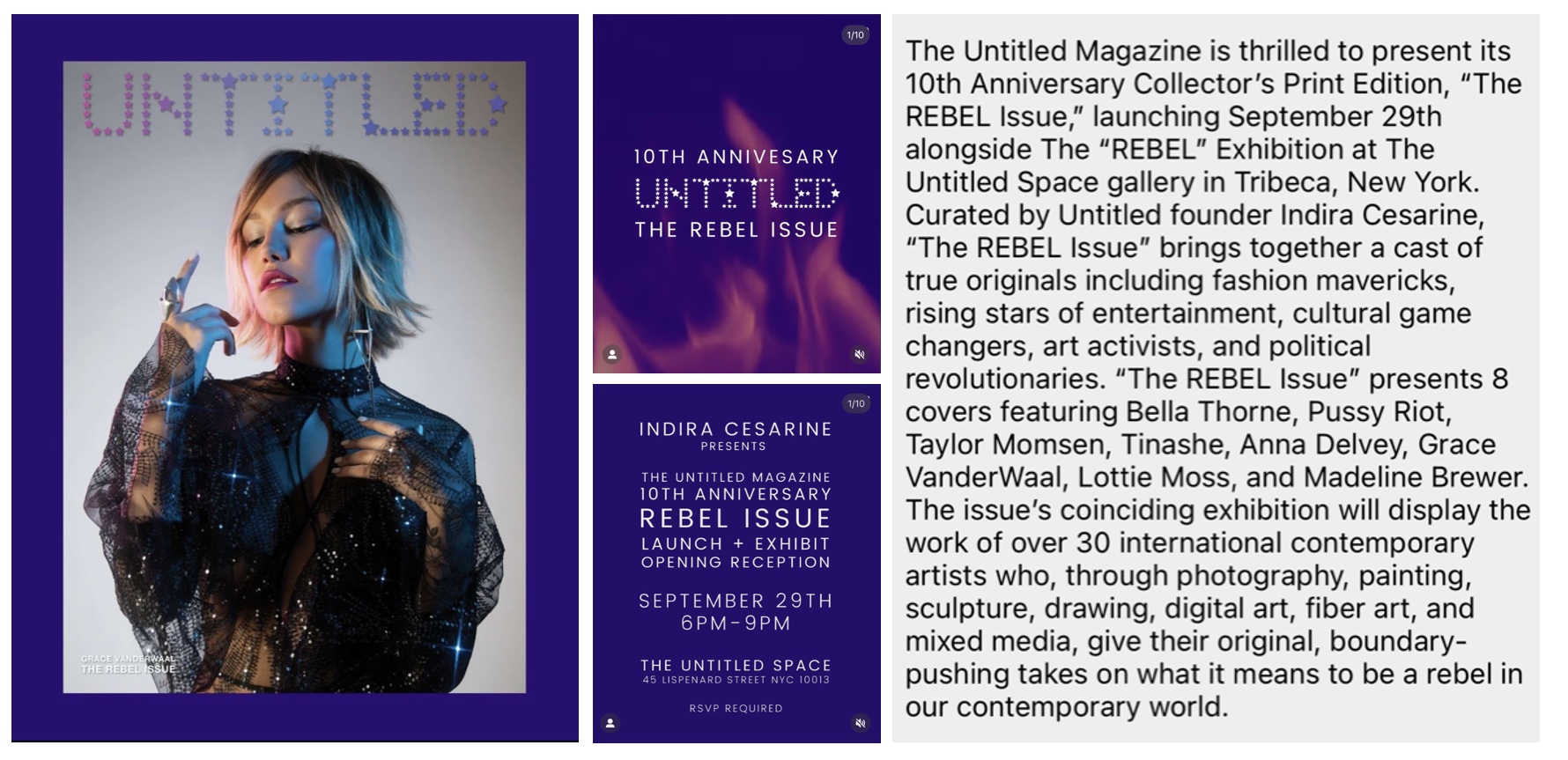 Untitled Magazine announced their 10th Anniversary Collector's Print Edition, "The REBEL Issue". Grace will be featured as one of their "rebels." The photo shoot for this took place on July 23rd. The issue was launched at an event in New York on September 29th.