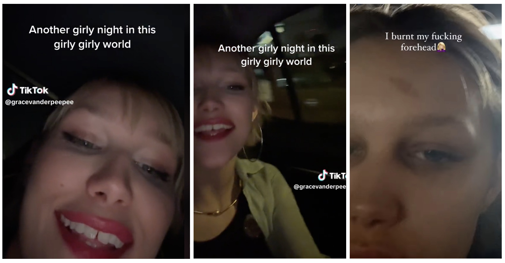 Grace first posted a short happy video on TikTok from a car on her "Girly night out" (set to a snippet of the "lala" theme from the Gilmore Girls), and later another short and less happy video on IG Stories, having burnt her forehead.