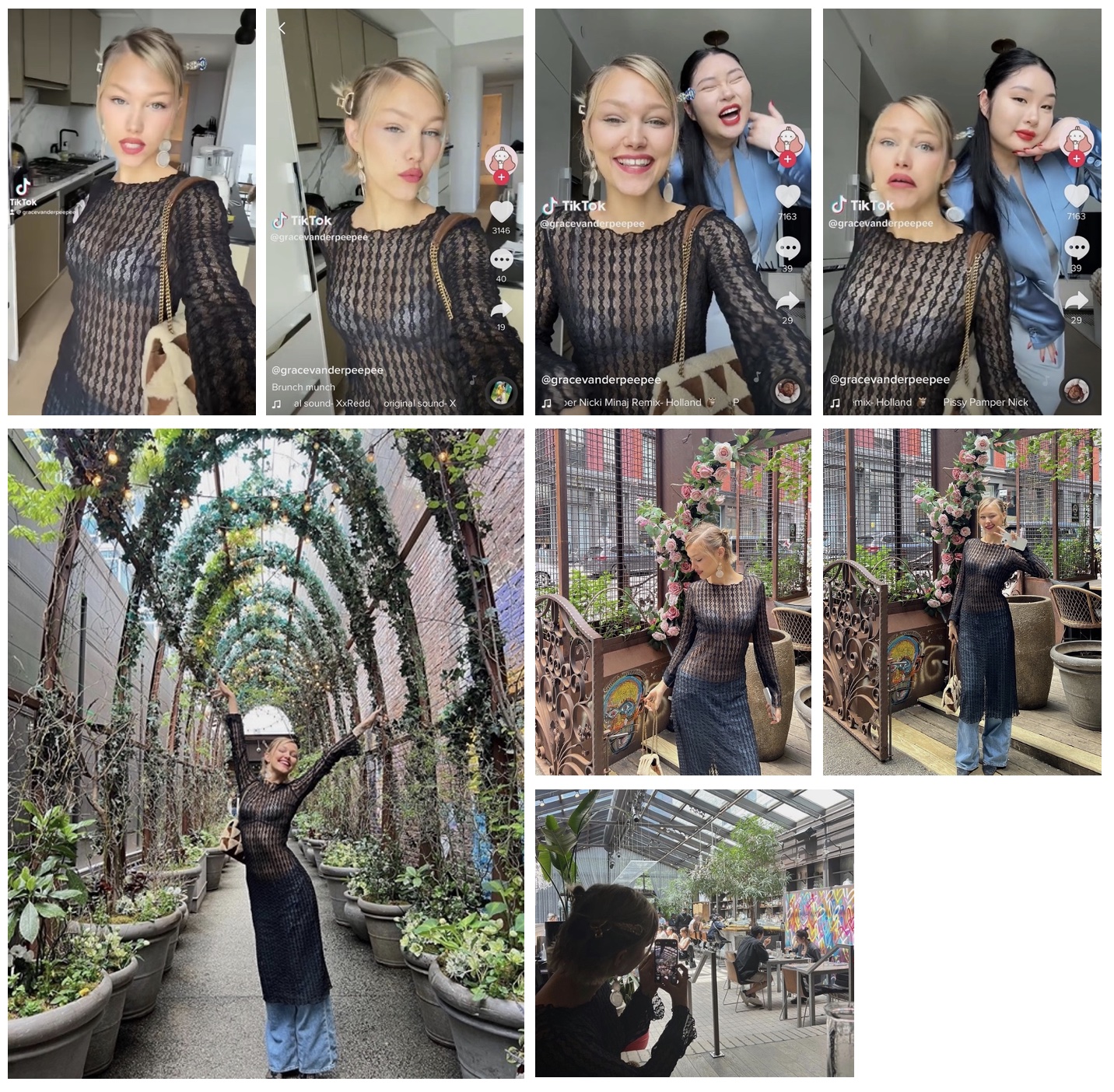 Grace is apparently still living in New York at her old schoolfriend Lauren’s flat. She posted pictures on TicToc of her and Lauren in the flat (here and here), and some pics from a restaurant, with the caption “Jeans under dresses 2023 babe"