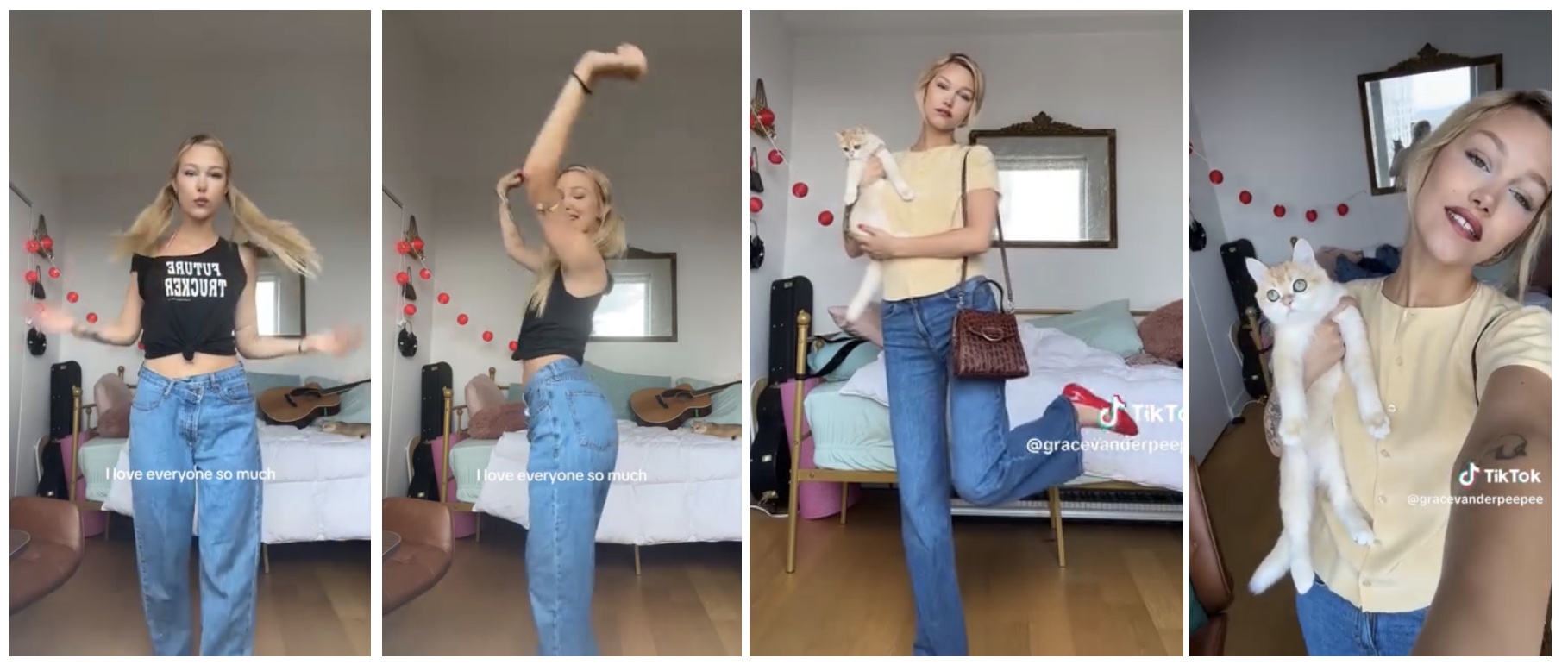 Dancing to Bob Marley and The Whalers’ “Could You Be Loved" with the caption "I love everyone so much". And psong with her cat to Billie Holliday singing "I'll Be Seeing You"