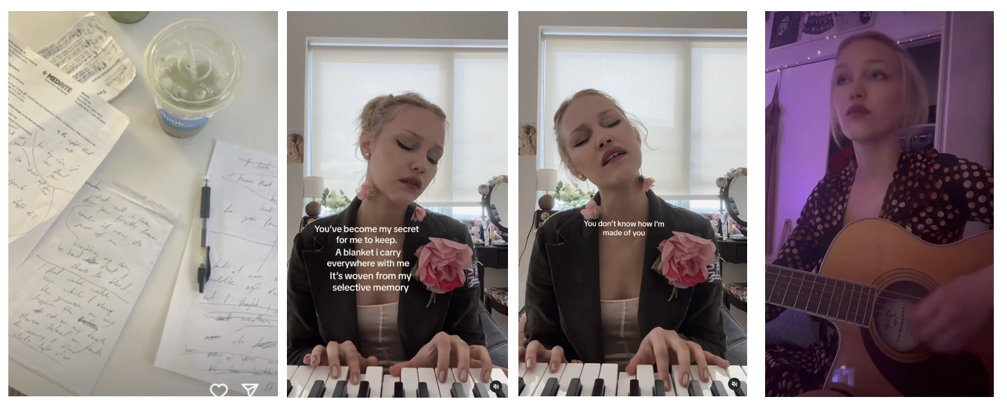 Grace posted two songs to her social media. The first one, an original, she had written just the day before. The second one was a cover of Suki Waterhouse’s “Brutally". That one was presumably recorded on the 21st when she did another cover, playing the piano and in the same clothes. She also posted a picture of some handwritten lyrics - for, what later turned out as "What's Left of Me".