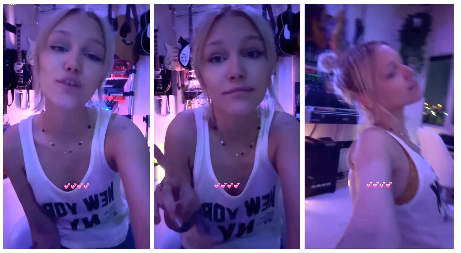 Grace posted a short clip from the studio on IG stories, lipsycing to a production of a new song.
