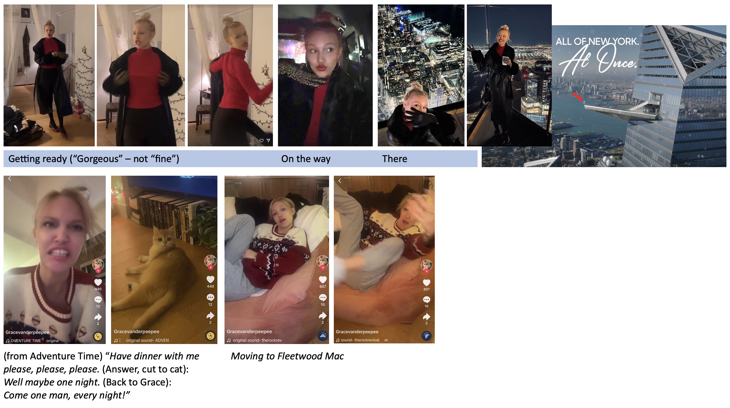 Grace treated us to a lot of SoMe Posts that day on both IG Stories and TikTok. As she was preparing to go out she mimed to a scene from the US Sitcom "The Nanny" where the nanny Fran Fine (played by Fran Drescher) does not want just to look fine, but gorgeous. Grace’s and Tina's evening appears to have started taking in the views – and a hot drink - at the roof deck of "The Edge" a recent (2023) luxury condominium complex in the Williamsburg part of Brooklyn. Grace also posted two TikToks. One where she mimed to a scene from Adventure Time season 5 episode 7 (including her cat in the skit), and one where she moved to the sound of a live recording of Fleetwood Mac’s "Silver Spring" , from a 1997 performance.