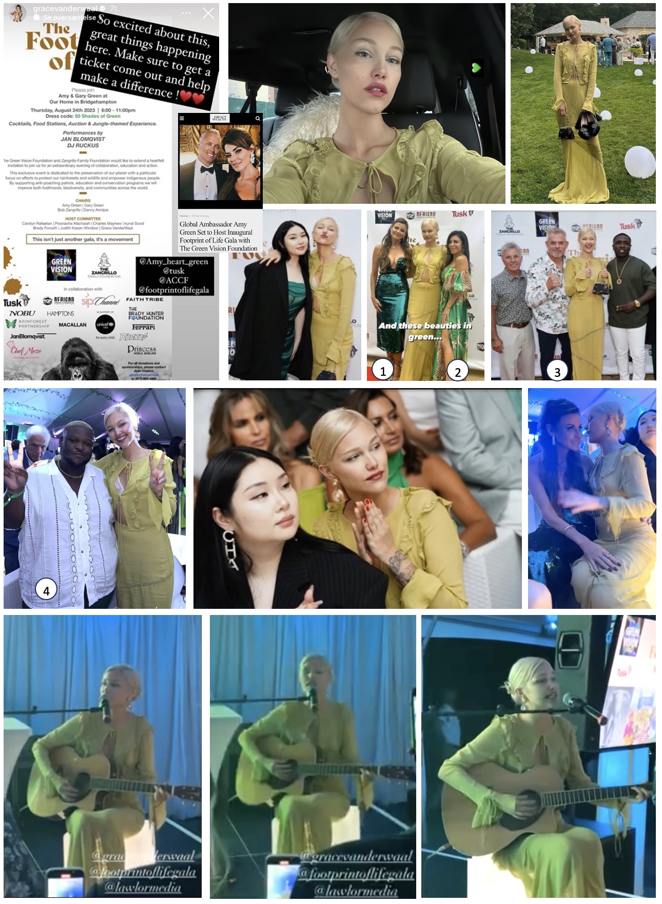Grace performed and attended, as a guest, the Footprint of Life Gala in the Hamptons on Long Island, New York. This exclusive event was: "...dedicated to the preservation of our planet, with a particular focus on efforts to protect the rainforests, wildlife habitats, and indigenous people across the world, supporting anti-poaching patrols, education and conservation programs that improve both livelihoods and biodiversity and empower indigenous people."