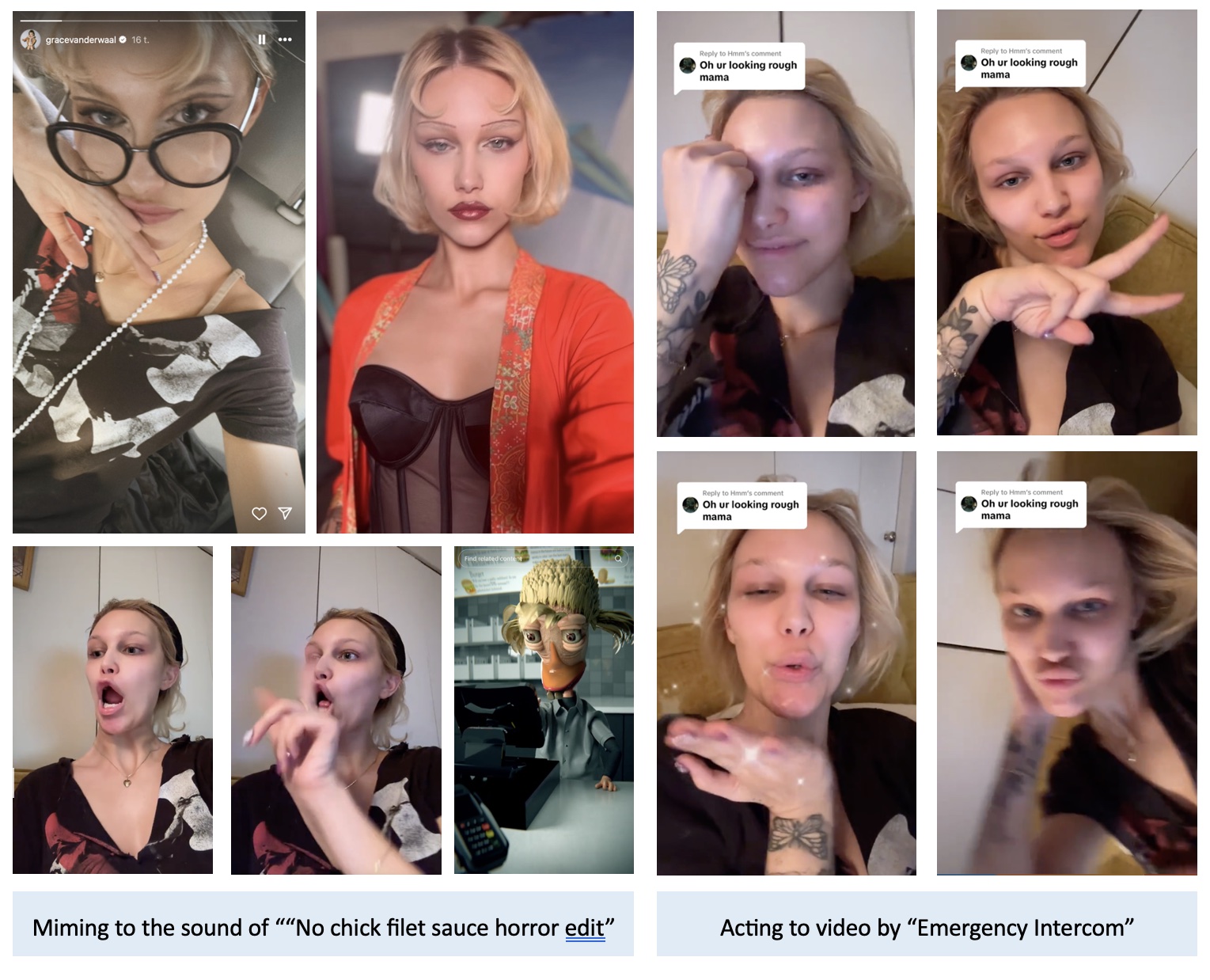 On the first post she mimed to the sound of "No chick filet sauce horror edit" by Rango Jalex an animator who by his own account "makes weird animations". The second picture in that row is a still from the original video.