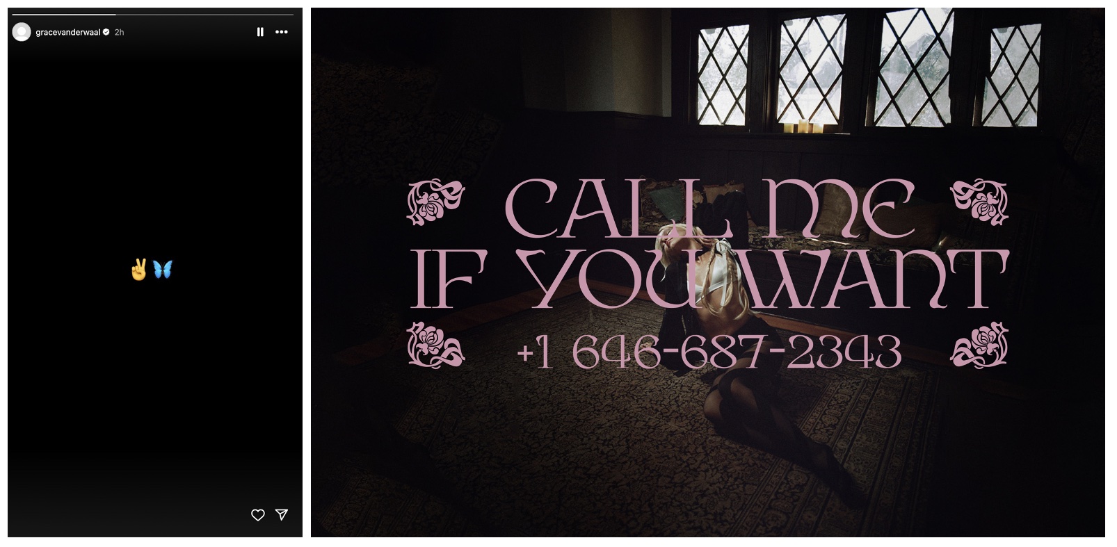 Grace deleted all her Instagram posts, including her profile photo. (Fortunately, we were able to find alternative sources for almost all the deleted Instagram posts.) All that was left was one post with a peace sign and a butterfly. At the same time, her website gracevanderwaal.com was changed. Calling the number shown played a voicemail: "Hi, I can’t really call right now; I’m in the middle of something. I’m going to send you a text. Love ya". The text then has a link to a file that plays a snippet of a new song "Call it What You Want"