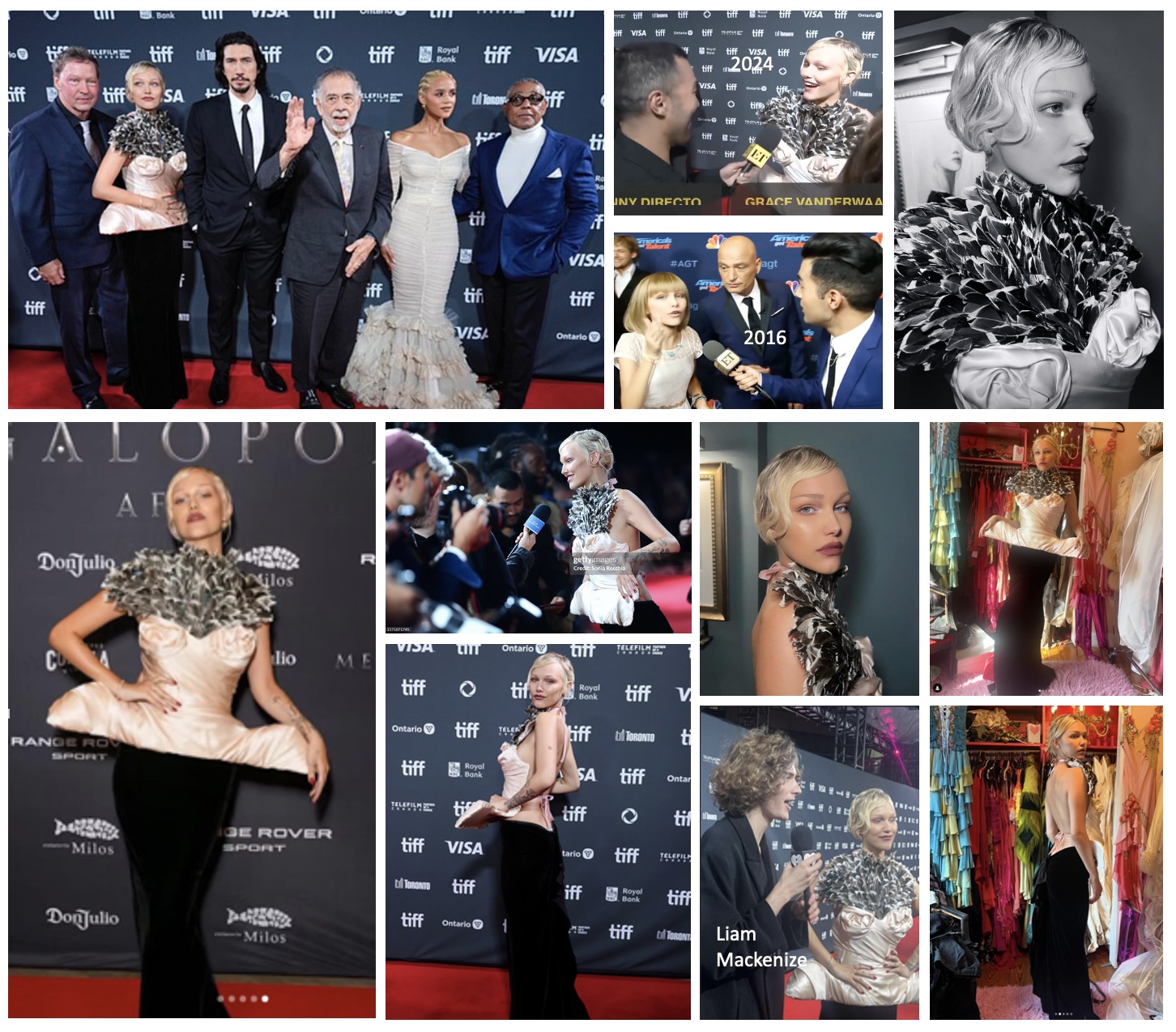 Dessert Star Vintage and Elza Khailfe posted pictures and a short video from the fittings at the Dessert Star Vintage shop: "Fittings with @gracevanderwaal for the premiere of Megalopolis at TIFF! Liam Mackenzie worked 50 hours to mold the corset to fit Grace's body". Liam, who attended the screening with Grace, posted a short video with Grace explaining the story behind the dress.