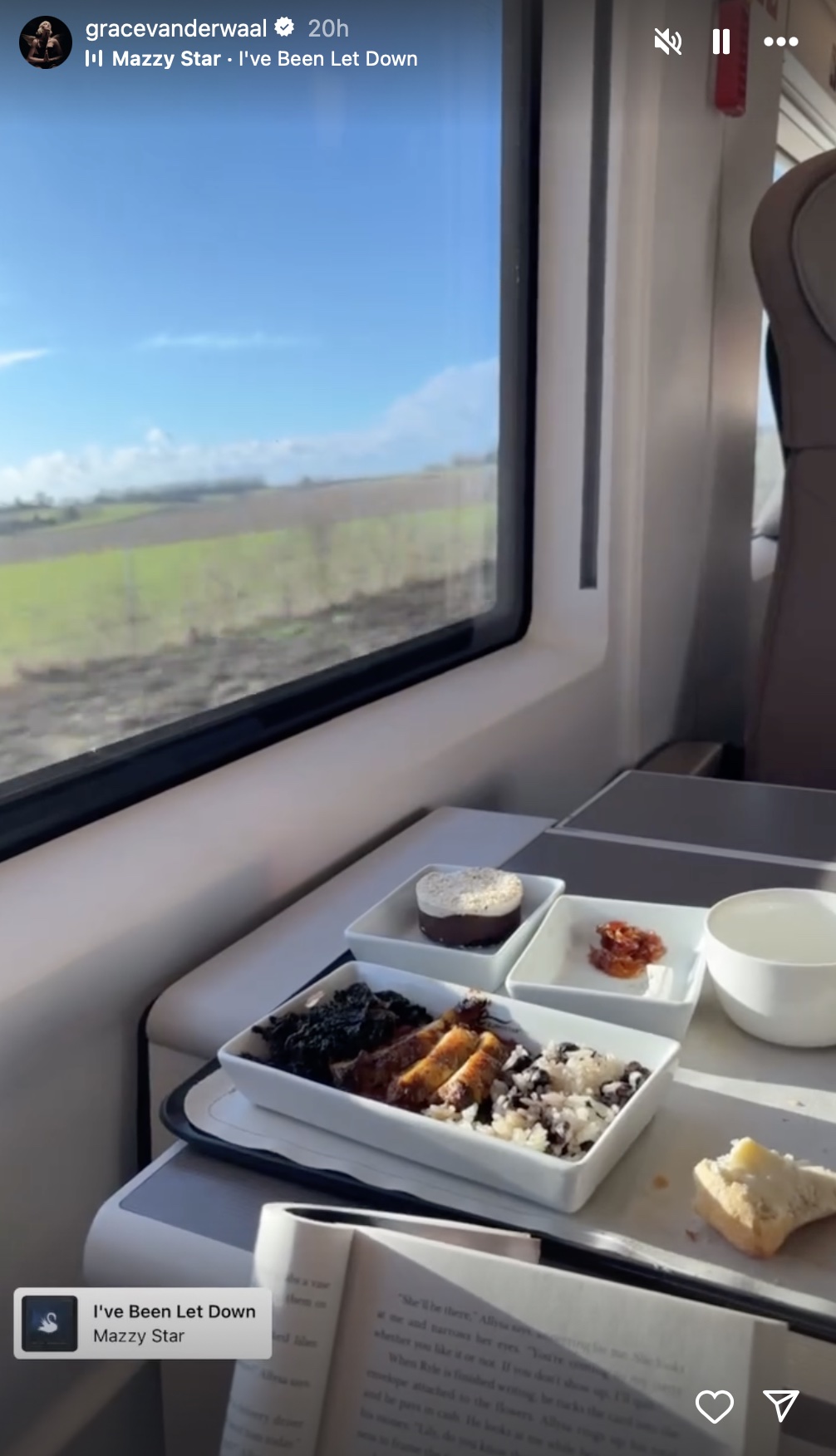 Grace posted a picture on IG stories traveling on the Eurostar high-speed train (Premier class) from Paris to London.