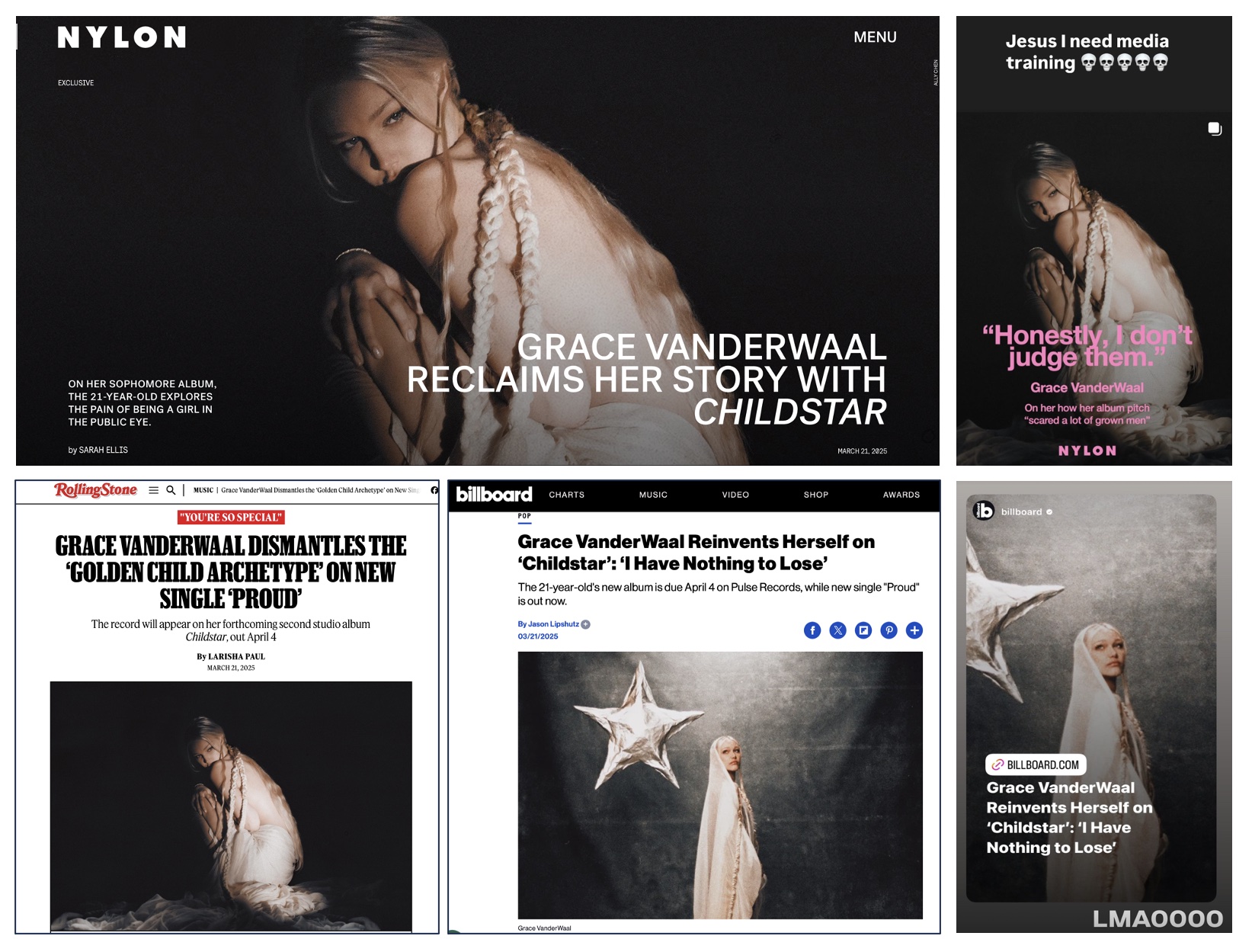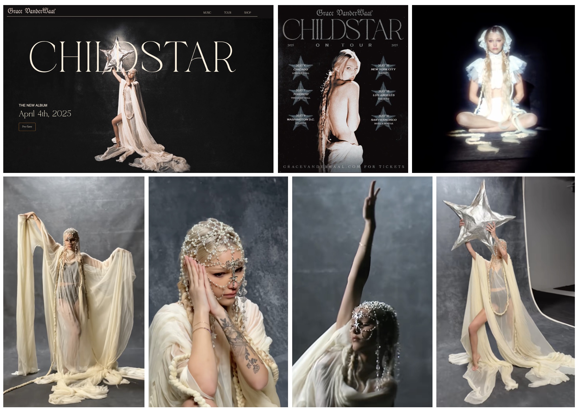 Grace announced the release date for her new album, she announced a short tour and released a short music video (a “visualizer”) for her recently released song “Proud”. In her Instagram post, which included a shirt video snippet from what we assume is a video for the album itself, grace wrote: "For a long time, I felt stolen. My face, my name, my body. I wrote and created my dream album/project, “CHILDSTAR,” as a means of processing those experiences. I am so proud of this body of work - I literally put all my tears into every word. A lot of people feel close to my story and nostalgic for my past. As much as I would like to honor that, it’s cathartic for me to proclaim truth and what is mine. I wanted to make a project that exercised all my passions: writing and producing, but also world building with fashion, color, and movement. Everything has been done with ultimate intention to carefully tell a story about girlhood, grief, identity, and control.