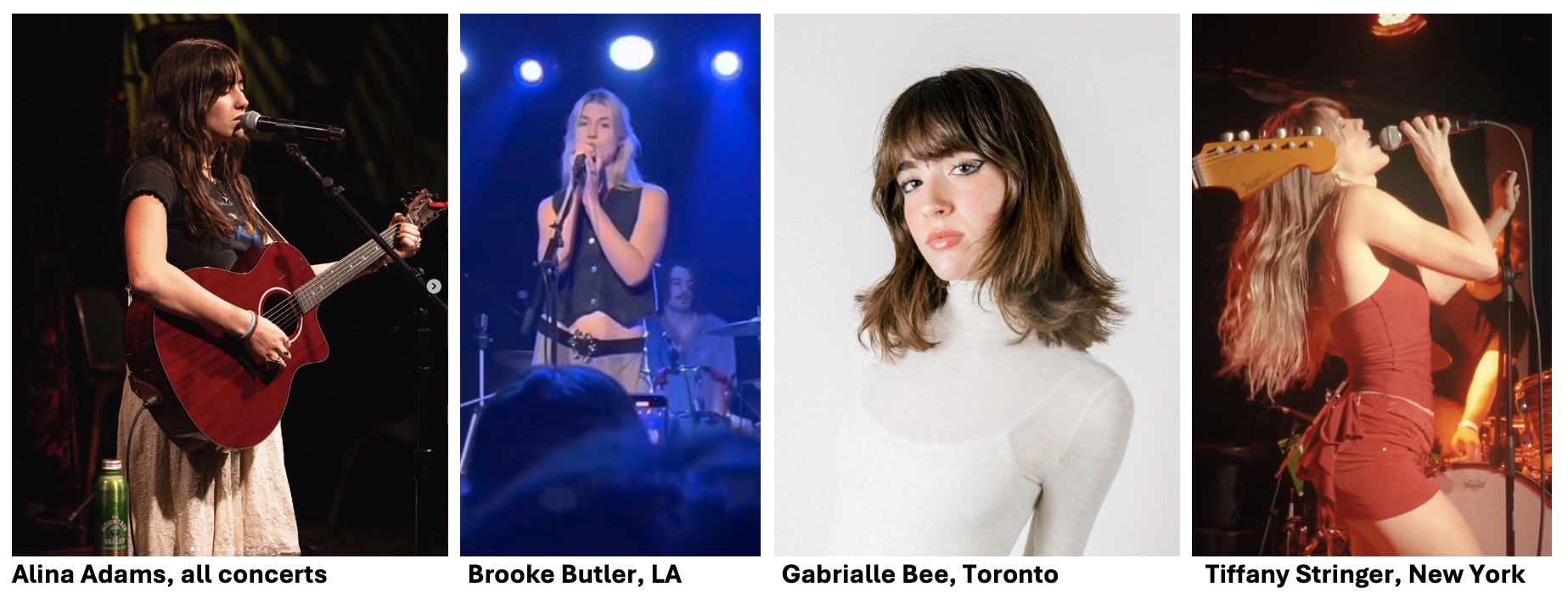 Alina Adams is an american singer/songwriter. At the time of the tour, she was about 18 years old, had self-published an EP and a handful of singles and had limited performance experience. She comes from a musical family, her father being a music producer and her older sister also a singer/songwriter. She had at the time a decent following online with 608 K followers on TikTok and 111 K on Instagram. Her latest single (by April 2025) was "I know, I know, I know" from March 2025.