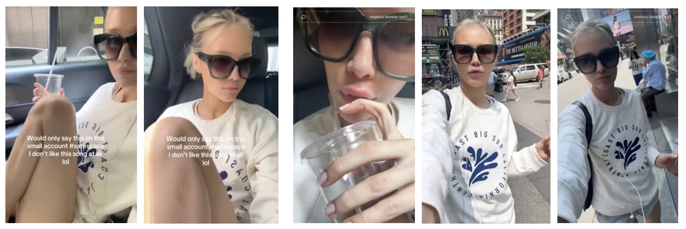Grace posted from a car and from the street. The first post set to Sabrina Carpenter’s “Manchild”. With the caption "Would only say this on this small account #safespace I don't like this song at all lol". The second post set to TIAGZ "Muffins In The Freezer"