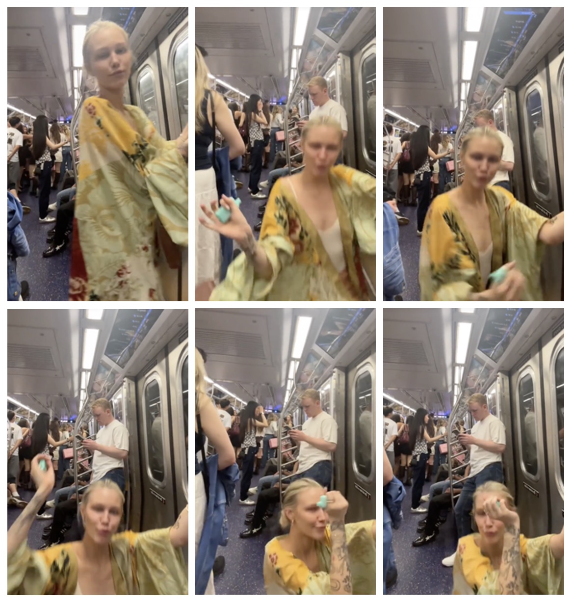 Grace was on the subway dancing to music we can’t hear. Posted with the caption "I louve this song 🫦🫦🫦"