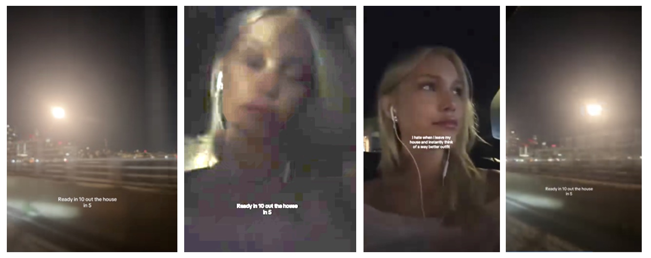 Grace posted twice from a car on her way out. First post with the caption "Ready in 10 out of the house in 5 - Another night avoiding all my responsibilities". Second post with the caption "I hate it when I leave my house and instantly think of a better outfit" set to the sound of somone saying "no thanks, I choose my own destiny"