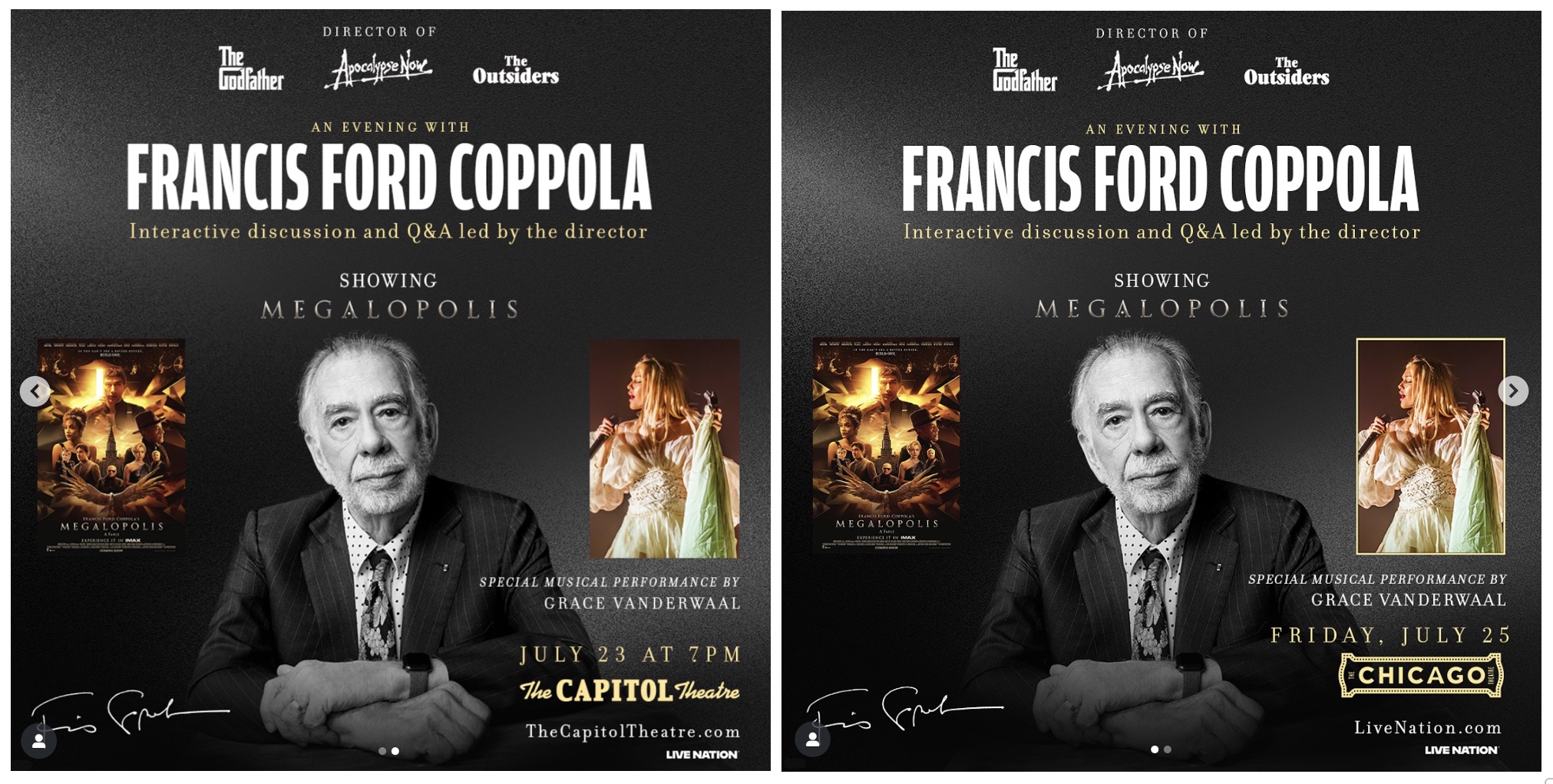 'This is the way MEGALOPOLIS was meant to be seen," shared Coppola, "in a large venue, with a crowd and followed by intense interactive discussions about the future.'