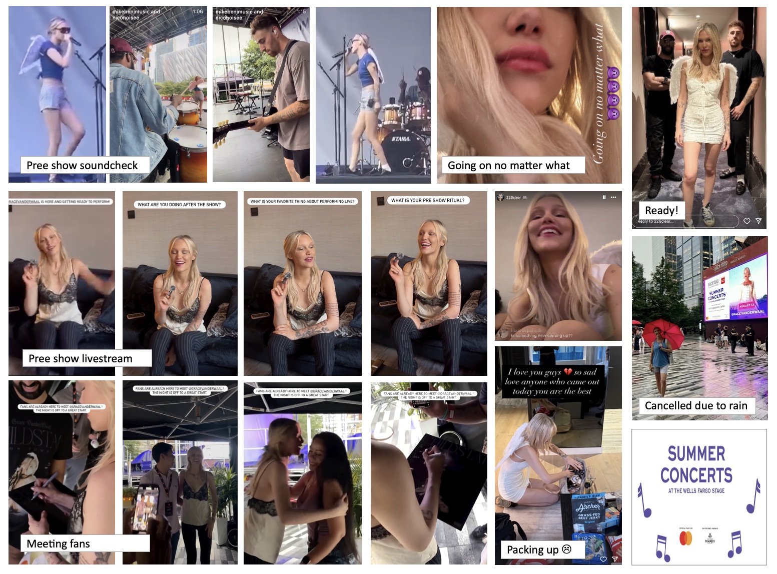 Grace was active on social media in the hours up to the show, she met fans and signed memorabilia, and was ready to go on stage no matter the weather. Some fans posted from after the cancellation, writing “Hail and 60 mph winds. We gave it a try, but at 7, they told us to go inside immediately due to severe thunderstorm warning. Waited until 8, but got cancelled as soon as the rain stopped ". Grace posted a picture of her packing up with the caption "Love you guys 💔so sad love anyone who came out today you are the best"