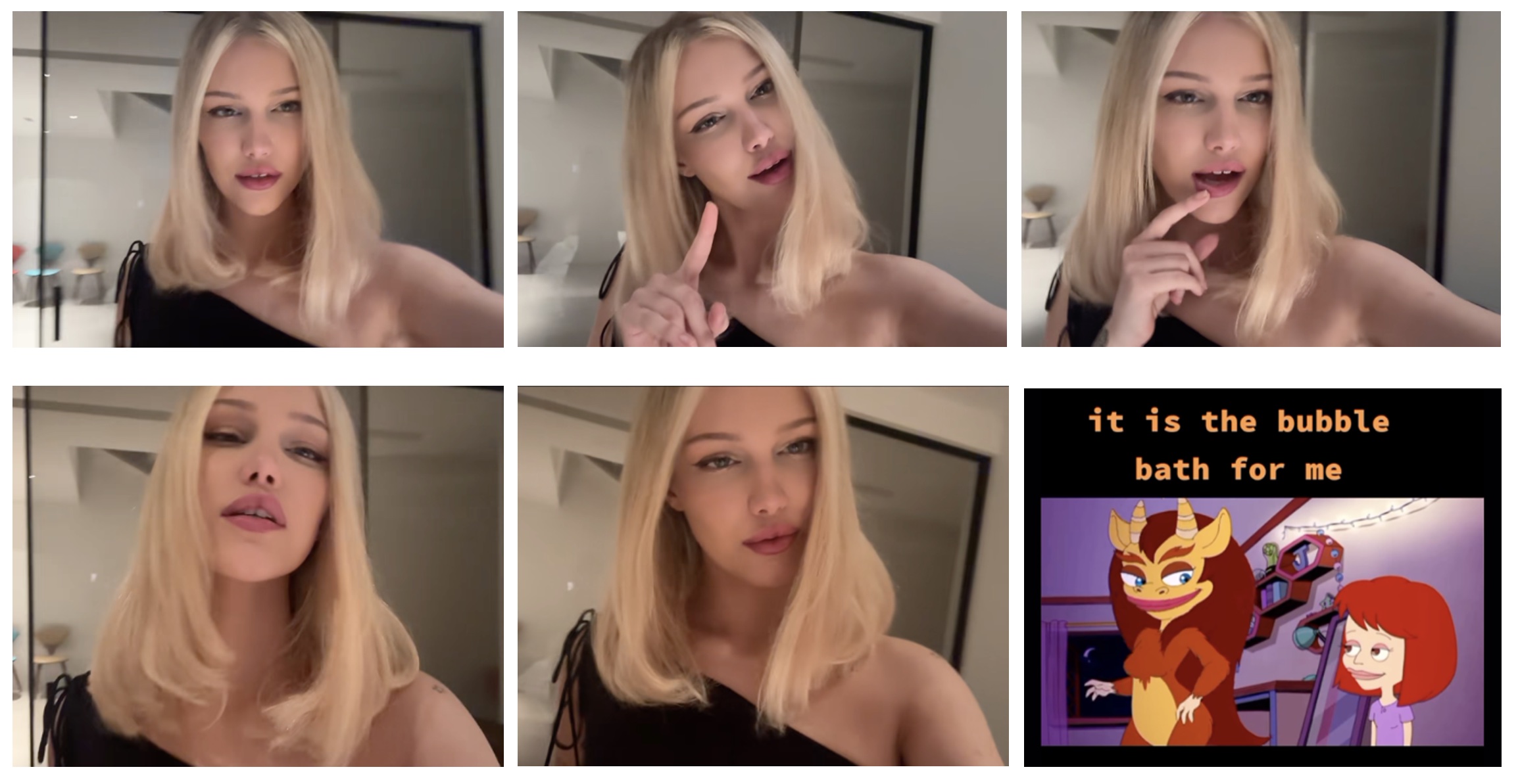 In the second post, she mimed to May Rudolph as Connie Hormone Monster in the animated TV-series "Big Mouth": Girl: "You’re very beautiful", Connie: "I know", Girl: "why do you smell so good?", Connie: "Because I don’t use deodorant and I only take bubble baths". (In the series, Connie is the female hormone monster, who helps girls go through puberty.)