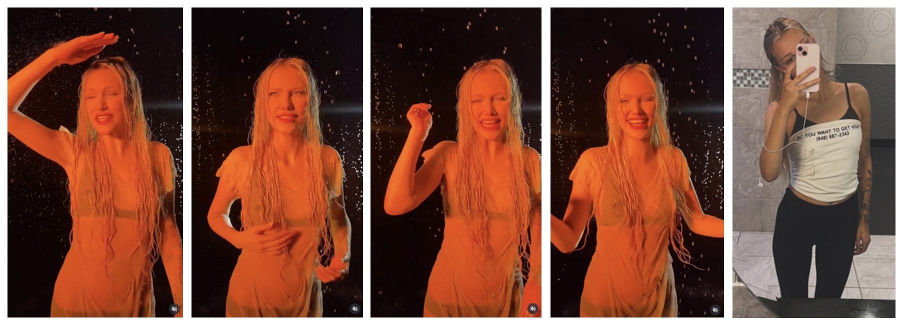 Grace posted another short clip from the vidoeshoot for her upcoming single, this time miming to a TikTok trend based on a clip from “Mean Girls” where Karen (Amanda Seyfried) says "Guys this is Karen Smith, it’s 60 degress and there is a 30% chance that it is already raining” – using her breasts to "feel" whether its raining. Grace also posted a selfie with her "Do Yoy Want To Get Ghigh?" top, set to Zara Larsson’s "Pretty Ugly".