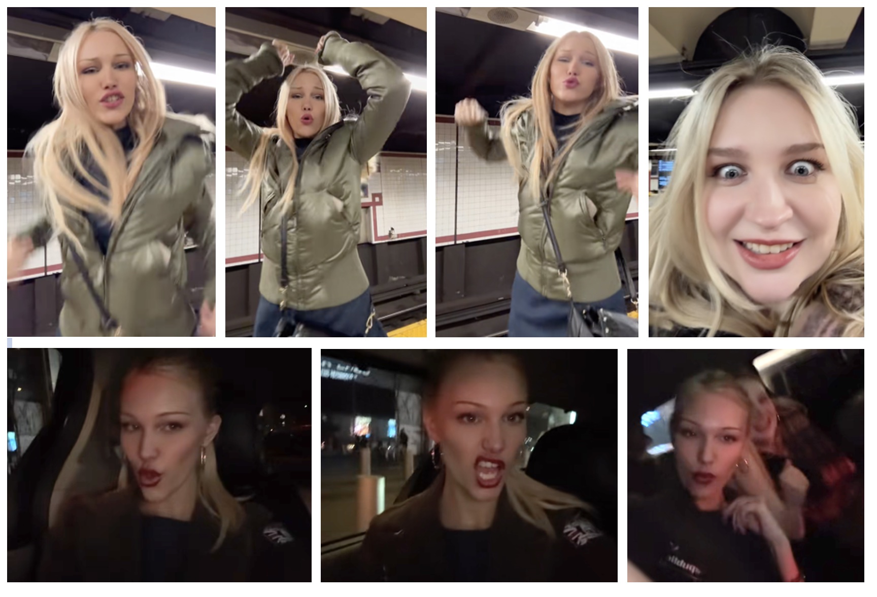 Grace posted from a night out with a friend, first from a subway station, miming to what appears to be a slowed down version of Payton King’s "What’s Up YouTube" TikTok meme (we haven’t been able to locate the original poste). Later from a car miming to Ellie Goulding’s "Lights"., with the caption "wearing a ponytail tonight don’t know how to feel about it".