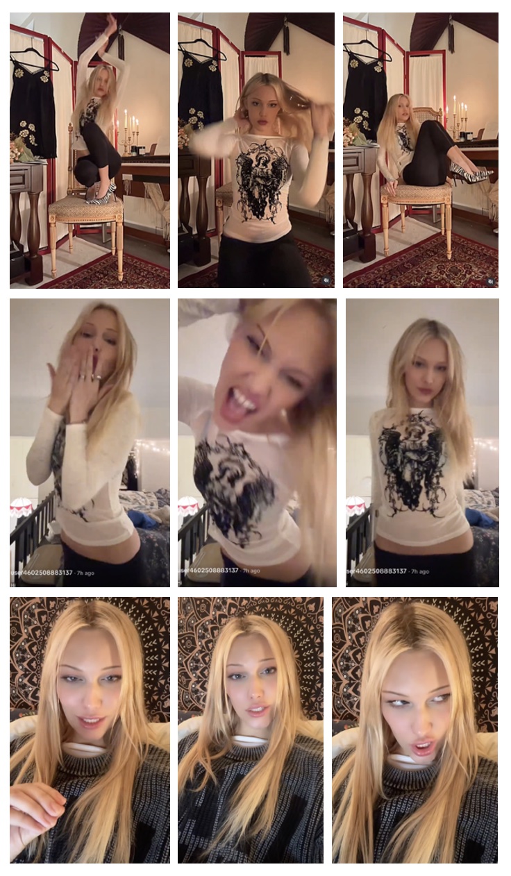 Grace posted "Outfits for Instagram to see" on Instagram and on Tiktok. In the first post, Grace (in a spedup video) "dances" to to the first few bars of argentinian composer Alberto Ginastera’s "Gato". In the second post, she moves to Bassvictim’s "27a Pitfield St". She also posted a TikTok miming to Melaina Trump reading christmas stories to children.