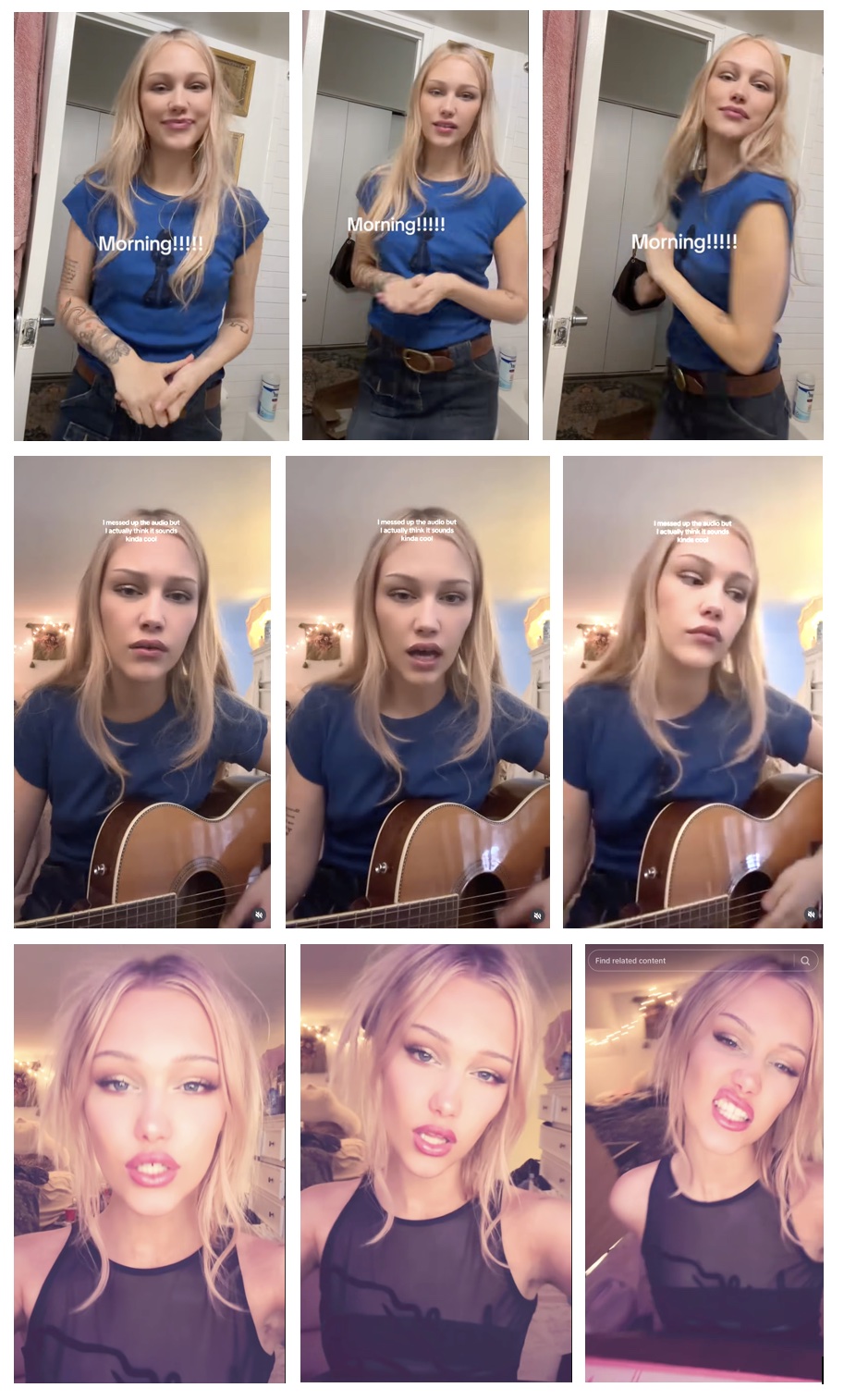 Grace posted three times on Social media. The first was a cover of Chappel Roan’s "Picture You". The second was a good morning post miming to Lana del Rey’s "57.5" (the lines "I hate everybody…"). The third time, with the caption "Words are whateever you want queen", miming to "Been Like This" by Doja Cat.