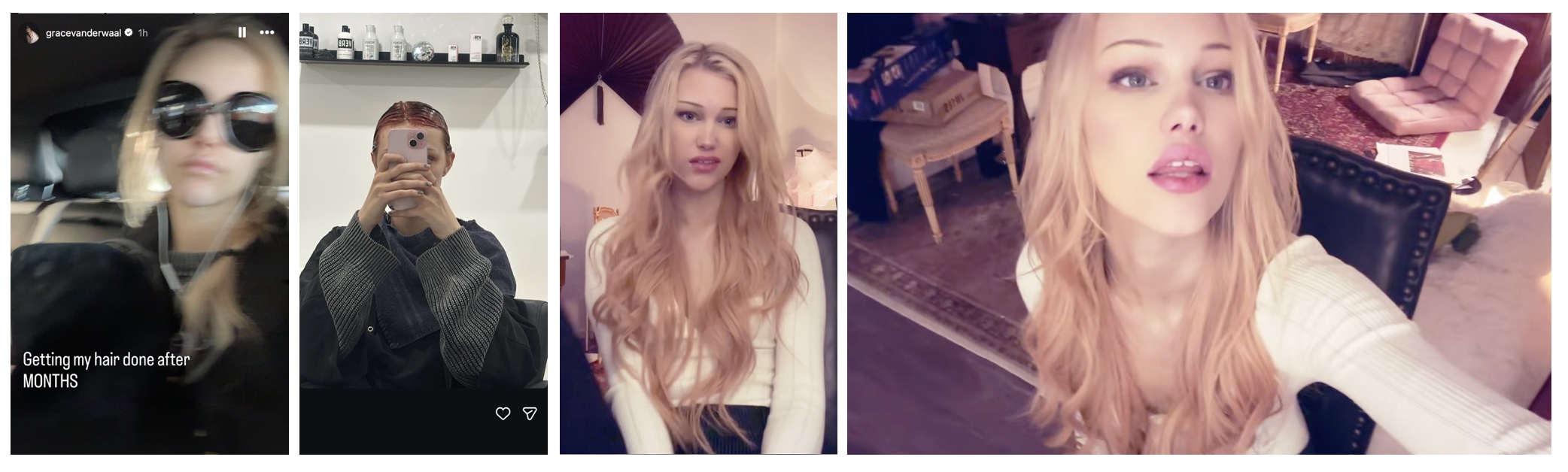 Grace got het hair done and posted on IG Stories and TikTok about it. On her way, at the salon, and twice (1), (2) showing the result. One set to My Ruin’s "Morning Prayer" and one set to Vashti Bunyan’s "I’d Like to Walk Around in Your Mind"