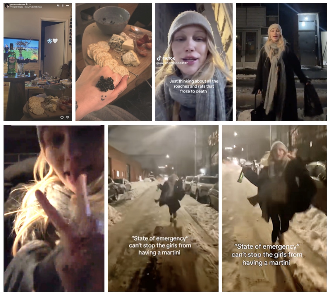 Grace posted on TikTok from the snow-covered streets of Manhattan, miming to Mars Argo’s "Nothing Without You", and waltzing down the street with a bottle in her hand, with the caption "State of emergency can't stop the girls from having a martini". And she posted with the caption: "Killem" - "Just thinking about all the roaches and rats that froze to death", mining to a scene from the TV-series Legion, where old lady Gladys (actually a demonic angel) says to a pregnant woman: "But its gona burn"<(i> pregnant woman: "what did you just say?" Gladys: "I said you’re fucking baby's gonna burn".