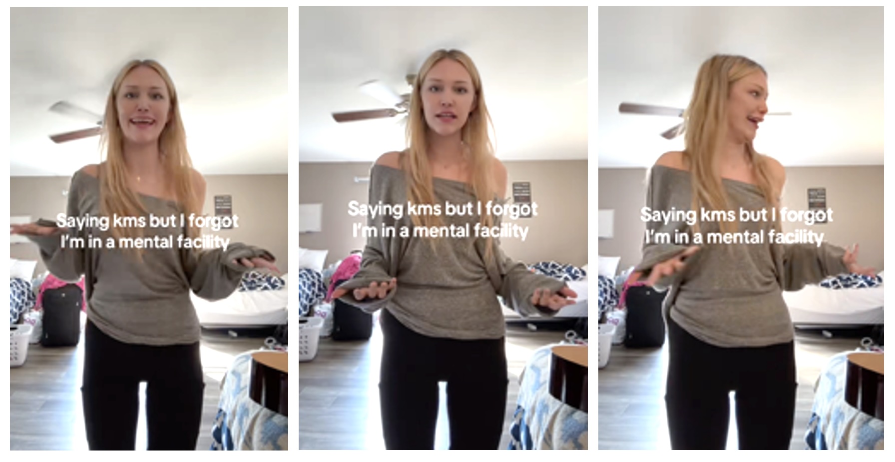 Grace posted on TikTok with the caption "Saying kms [killing myself] but I forgot I’m in a mental facility", in the clip she mimed to the sound from a scene from an episode (Fools in April) from the animated TV series SpongeBob Squarepants, where character "Squidward Tentacles" (voiced by Rodger Bumpass) says"“I’m just kidding, cmon, you guys know I was just kidding, right?", after having tricked SpongeBob into falling into a trashcan full of goop.