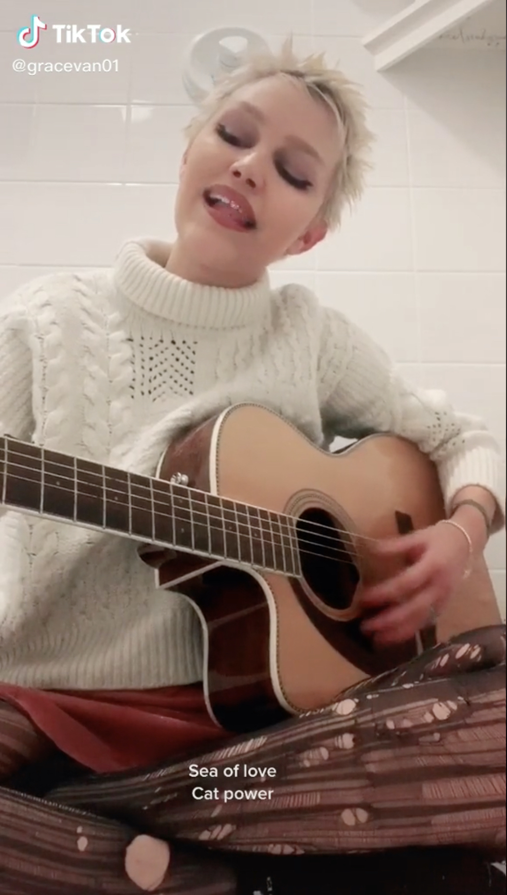 Sitting croslegged on the floor with her guitar, Grace once again, used a the ambience of a bathroom for a song.